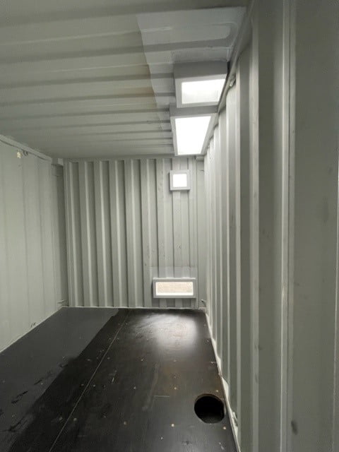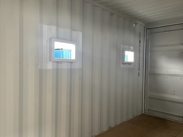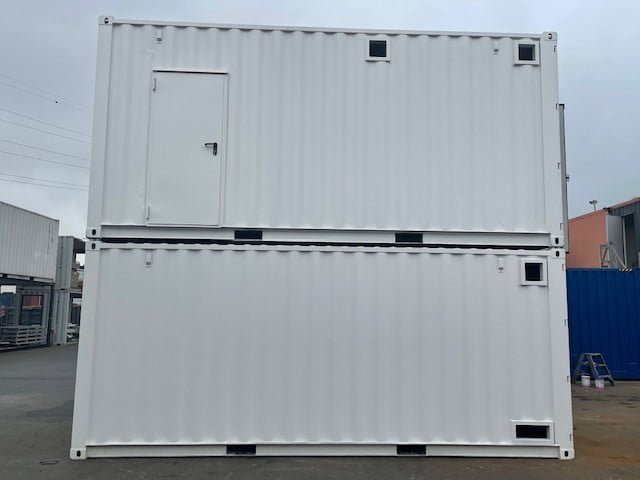 A 20' Dry Van and 20' High Cube container were modified for use in water treatment. A Hormann door with panic bar was installed in both containers. Openings were also provided for drain and maintenance flotation. Openings were provided in the floor and roof for drainage and a coupling frame was provided for the connection between both containers.