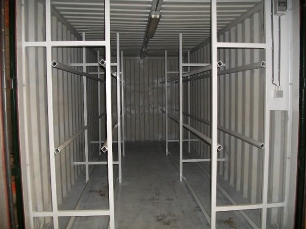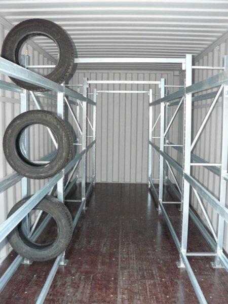 Racks can be placed in just about any type of container. A 2-, 3- or 4-layer rack with shelves made of concreteplex wood panels can be placed on either the long or short side of the container. Tire racks can also be placed.