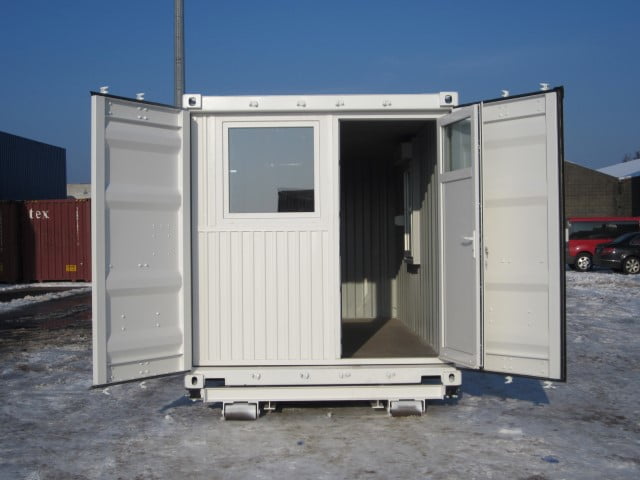 This 20' Dry Van was converted to a lifeguard station with storage. A hook system and windproof panel with access door and window were installed. The panel can be opened all the way. A window with shutter was installed in the long side.