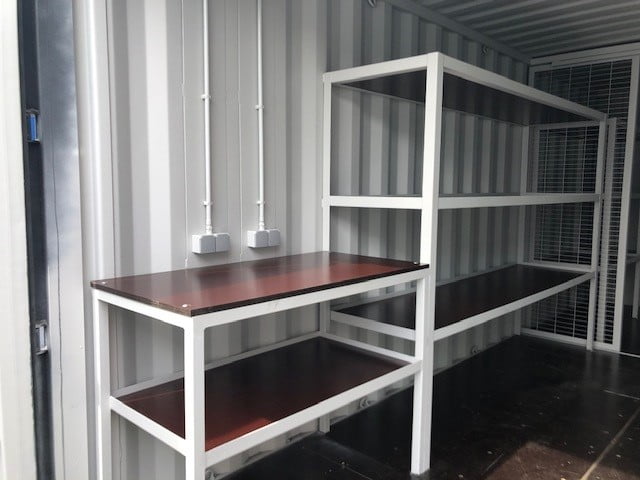 Converted a black ex-rental 20' Dry Van to a custom yard container for our client. A partition wall with lockable sliding door, 3 shelves, a workbench, coat racks and basic electrics were installed.