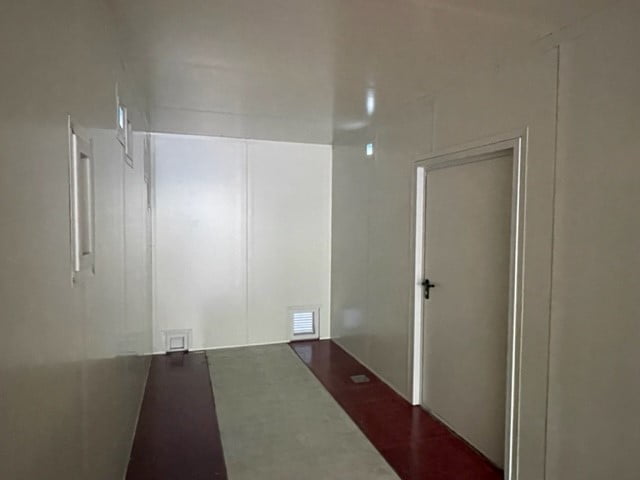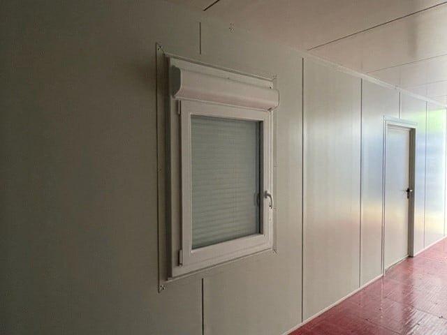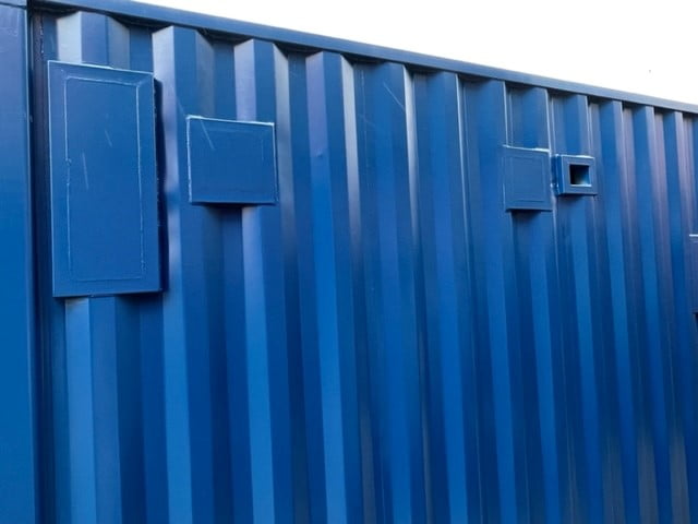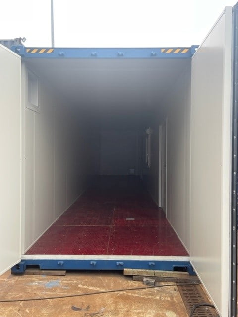 Deze 40' High Cube container werd omgebouwd voor gebruik in waterzuivering. Er werden 2 deuren en een raam geplaatst, basis elektra, isolatiepanelen en verschillende openingen.